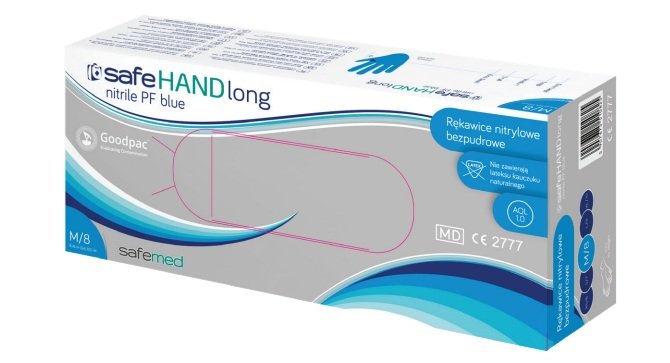 safeHAND long, modré s prodlouženou manžetou, 6,2 g; AQL 1,0, bez pudru. Více